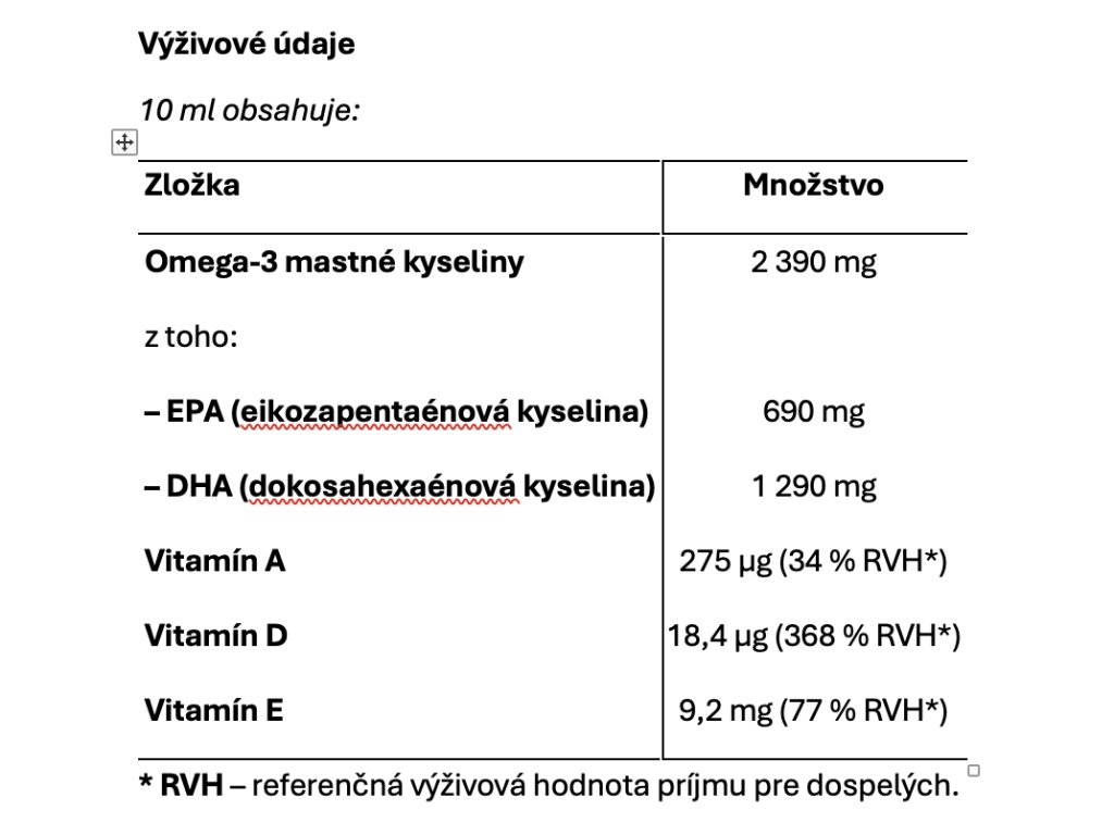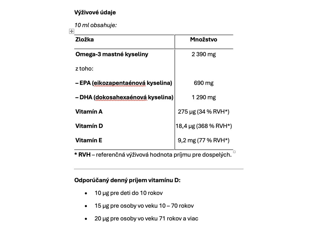 Produkt je prirodzeným zdrojom omega-3 mastných kyselín EPA a DHA a obsahuje vitamíny A, D a E, ktoré zohrávajú významnú úlohu v detskom organizme.