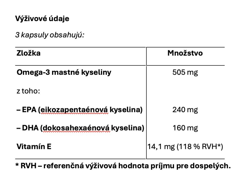 Jedna kapsula obsahuje: 500 mg omega-3 rybieho oleja.
